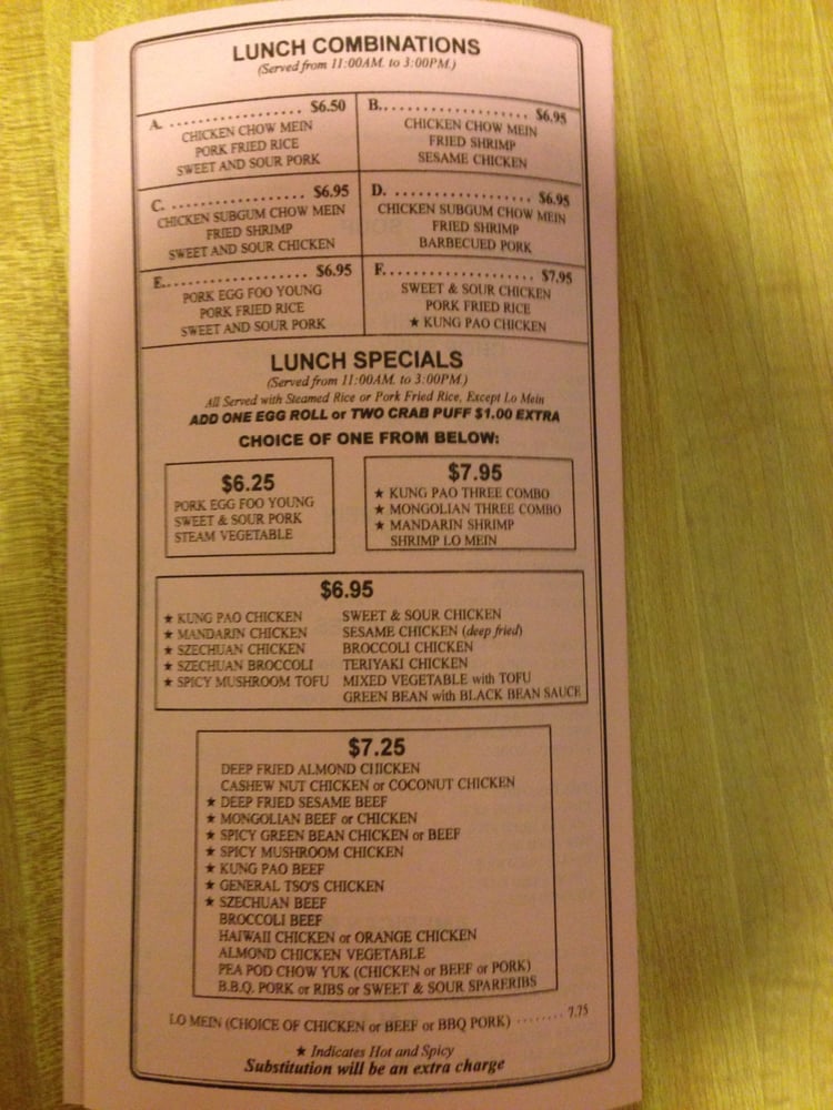 BBQ pork, egg rolls, Special Chow Mein, Pork Fried Rice, Fried Shrimp, Sweet & Sour Chicken