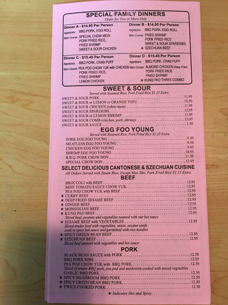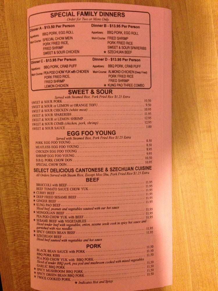 BBQ Pork, Egg Rolls, Szechuan beef, Pork Fried Rice, Fried Shrimp, Sweet & Sour Spareribs