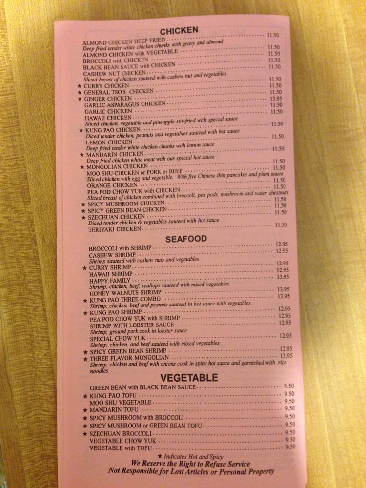 BBQ pork, Crab Puffs, Pea Pod Chow Yuk with Chicken, Pork Fried Rice, Fried Shrimp, Lemon Chicken
